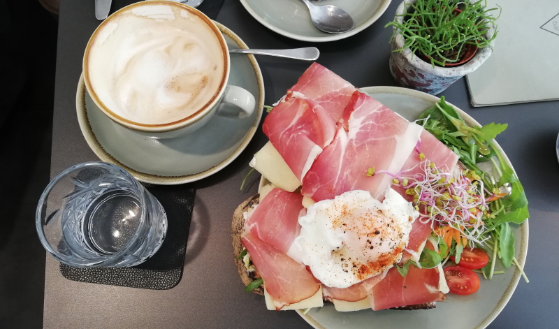 Beim Lesen des Frühstücksangebots lief mir schon das Wasser im Mund zusammen. Mal etwas anderes ausprobieren und den Tag mit einer guten Grundlage beginnen. Nun, das ist mir gelungen. Mein Schinken Röstbrot passt nicht einmal mehr auf den Teller. Zwei große Scheiben des Röstbrots belegt mit Käse und Schinken. Bestrichen ist das Ganze mit einem sicherlich hausgemachten Pesto und garniert mit Rucola. Als wäre das nicht genug, bekomme ich ein Ei noch oben drauf. Im Café deer wird mit den Leckereien wirklich nicht gegeizt.