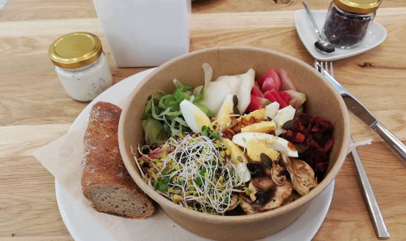 Dann mal her mit Thomas‘ Wahl. Die Bowl besteht unter Anderem aus Erbsen, einer Getreidemischung, Karotten, Rettich, Ei, Champignons und einer Kürbis-Linsencréme. Im ersten Moment frage ich mich „und das soll wirklich alles hier in dem Schälchen drin sein?“. Aber natürlich! Auch wenn die Portion auf den ersten Blick gar nicht so groß wirkt, macht es hier auf jeden Fall die Mischung. Mit meinem selbst ausgewählten Meerrettich-Dressing wird diese wilde Kombination perfekt abgerundet. Mit jedem Bissen hat man eine neue Geschmackskomposition im Mund und ich bin total begeistert davon. 7,95 Euro inklusive frischem Brot und Dressing: Da kann man wirklich nicht meckern.